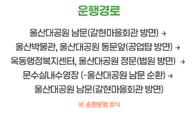 2025 울산대공원 장미축제 기간 중 2025년 5월 24일부터 25일까지 무료 셔틀버스를 운행합니다. 운행 구간은 울산대공원남문을 순환운행하는 코스로 진행되며 자세한 운행경로 및 지도 안내는 다음과 같습니다.